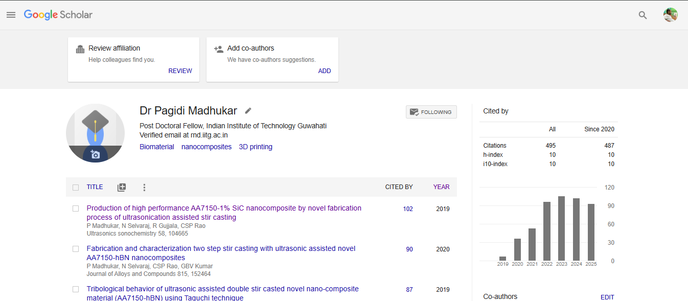 I have a strong multidisciplinary background spanning materials science, mechanical engineering, Bioengineering and Indian knowledge systems. My doctoral work at NIT Warangal focused on the fabrication and experimental investigations of nanoparticle-reinforced Al7150 metal matrix composites, with expertise in stir casting, ultrasonic-assisted casting, functionally graded materials, and advanced characterization techniques (OM, SEM, XRD, DSC, FTIR, UTM, wear and tribological studies). I extended this into applications such as additive manufacturing, high-temperature shape memory alloys, biomaterials, and self-healing materials. At IIT Guwahati, my postdoctoral research explored ancient herbal plant-based applications for food grain preservation, bridging traditional knowledge with modern nanotechnology and sustainable storage solutions. Alongside, I have industry experience in applied R&D and teaching experience at leading Indian institutes. With 23 publications (17 SCI, 4 Scopus, 2 book chapters), an h-index of 10, and expertise in composite materials, nanotechnology, tribology, and sustainable biomaterials, your research demonstrates both depth and versatility. My current interests include developing advanced composites, plant-based nanomaterials, and functional materials for energy, health, and marine applications, aligning well with global research priorities in sustainability and advanced manufacturing.