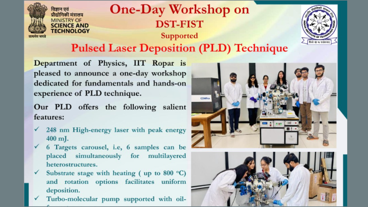 The Department of Physics, IIT Ropar, invites participants to a one-day hands-on workshop on Pulsed Laser Deposition (PLD) Technique, supported by DST-FIST, on 25 November 2025. This training is tailored for researchers and students keen on exploring thin film fabrication, nanomaterial development, and modern materials science applications.