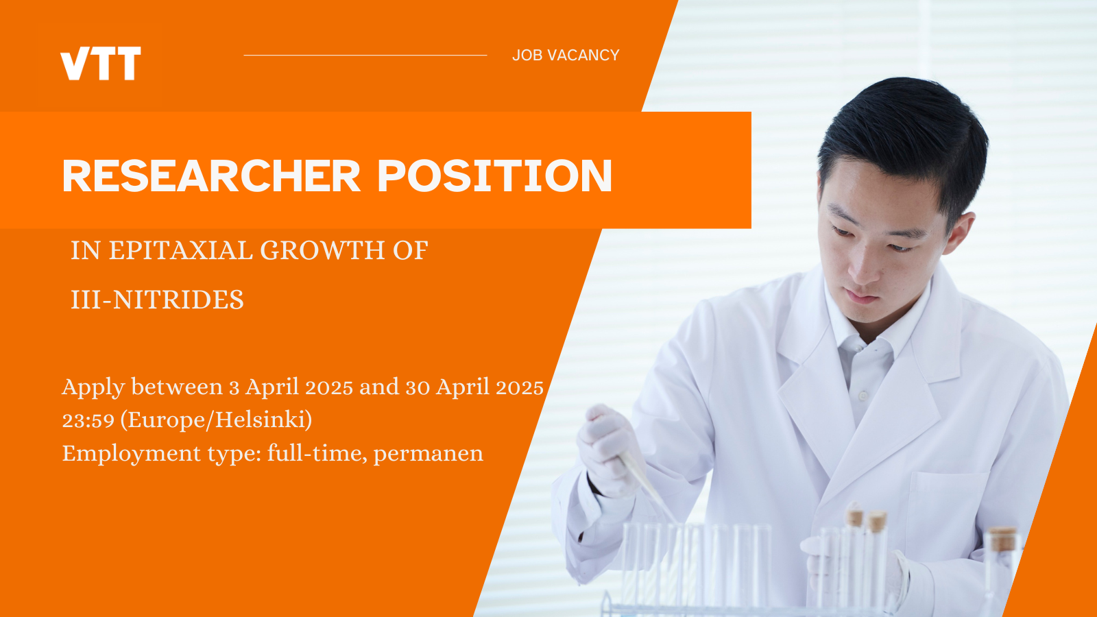 If you are an experienced researcher passionate about III-N semiconductors and eager to contribute to advancing power electronics technologies, this opportunity is for you. VTT is looking for talented researchers to join its nanoelectronics team, focusing on the epitaxial growth of III-N materials.